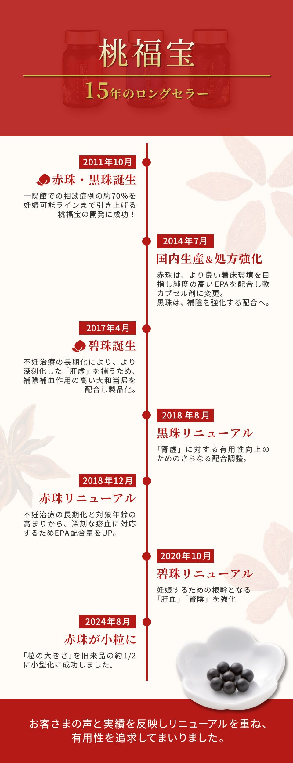 漢方に対する体質改善のご要望が多くなりましたが、従来の漢方処方では限界もありました。 子だくさんの時代には見られなかった現代特有の「妊娠しづらさ」を解決することが必要になったのです。 女性のライフスタイルの変化や社会環境の影響などから「根深い瘀血」や「慢性的な疲労」による妊娠力の低下という課題を解決するために現代人のための「新しい漢方」=桃福宝を開発した理由はここにあります。